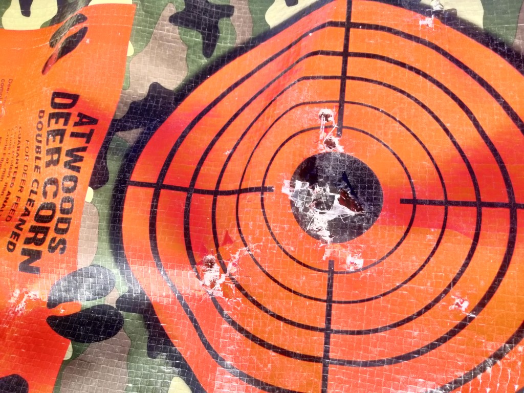 My first shot at 25 yards hit the black bullseye and my next two shots dropped right in on top of the first one. I was shooting from the bench with only a front bead and firing from the left-hand barrel.
