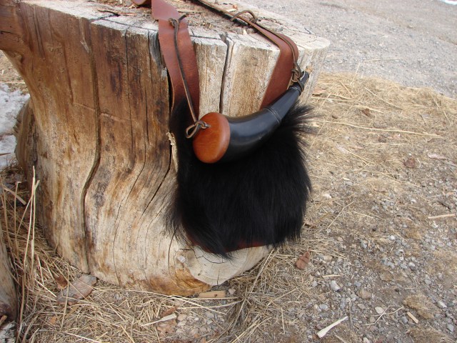 This weekend I made myself a new bullet pouch. It is a two compartment pouch from the Mountain Man sketch book vol 2. The flap is covered with hair on bear hide as pictured in the sketchbook on Mariano Modena’s bag. I have attached a Buffalo horn powder horn and will use this as my big game hunting pouch.