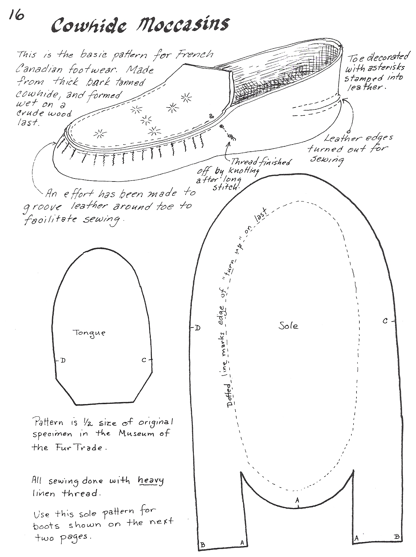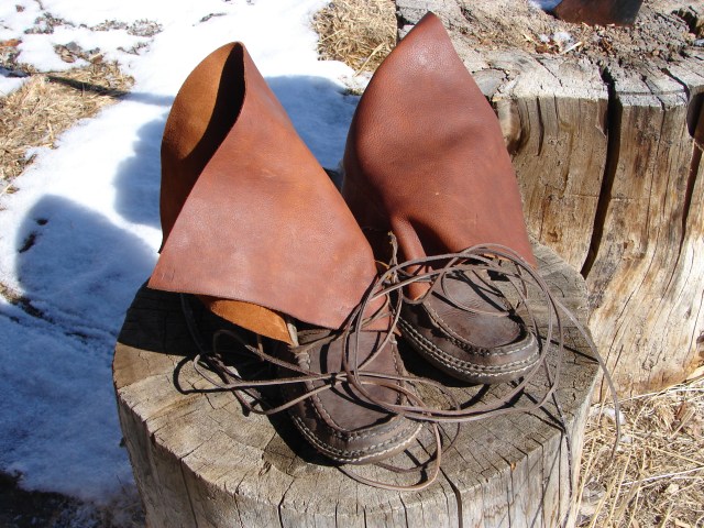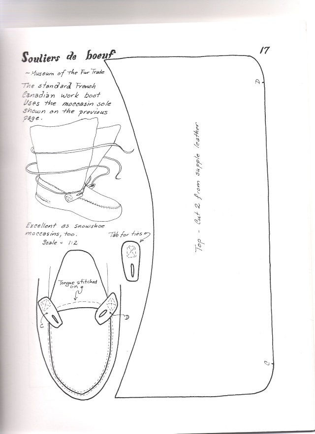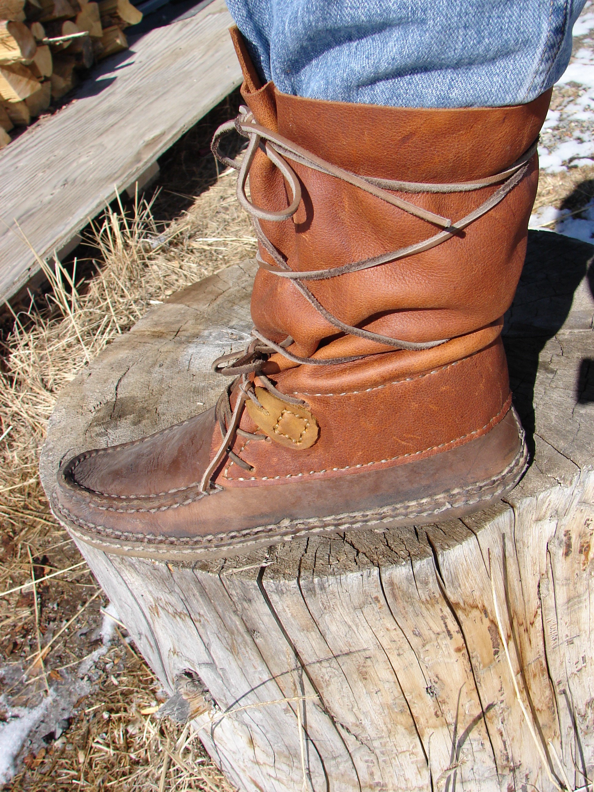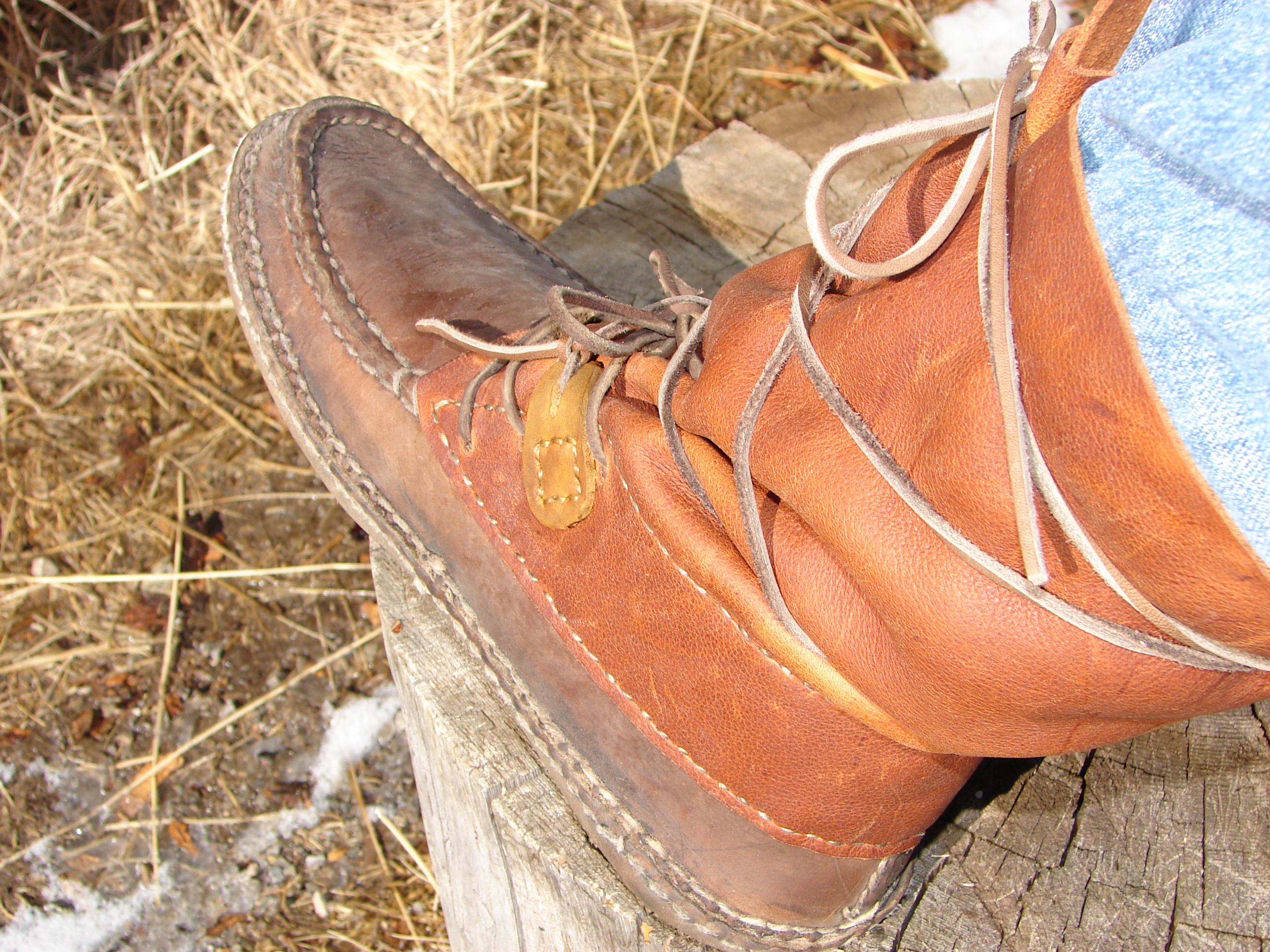 Years ago, when I was involved in the Great Lakes Fur trade I became very fond of  my heavy cowhide moccasins.  This type of moccasin was made in Montreal for use by the voyageurs.   The cordonniers of Montreal also used this basis pattern to make a high top moccasin called souliers de boeuf.  I have altered a set of my heavy cowhide Dyer brand moccasins to this style.