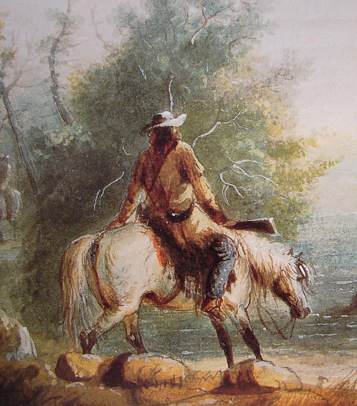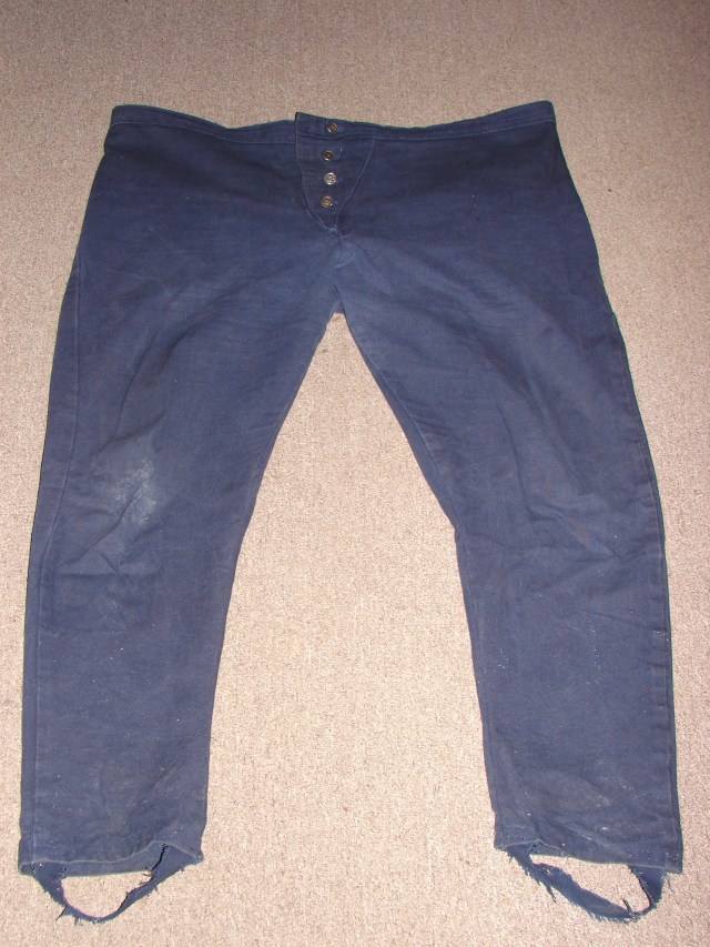 I wear cloth trousers & pantaloons as well as leather. These have either a drop front or a buttoned French fly as shown in the picture. Rex Allen Norman in his 1837 sketch book says “cloth trousers were….mostly in blue”. The loops on the pantaloons make putting my boots on over my pants a lot easier!