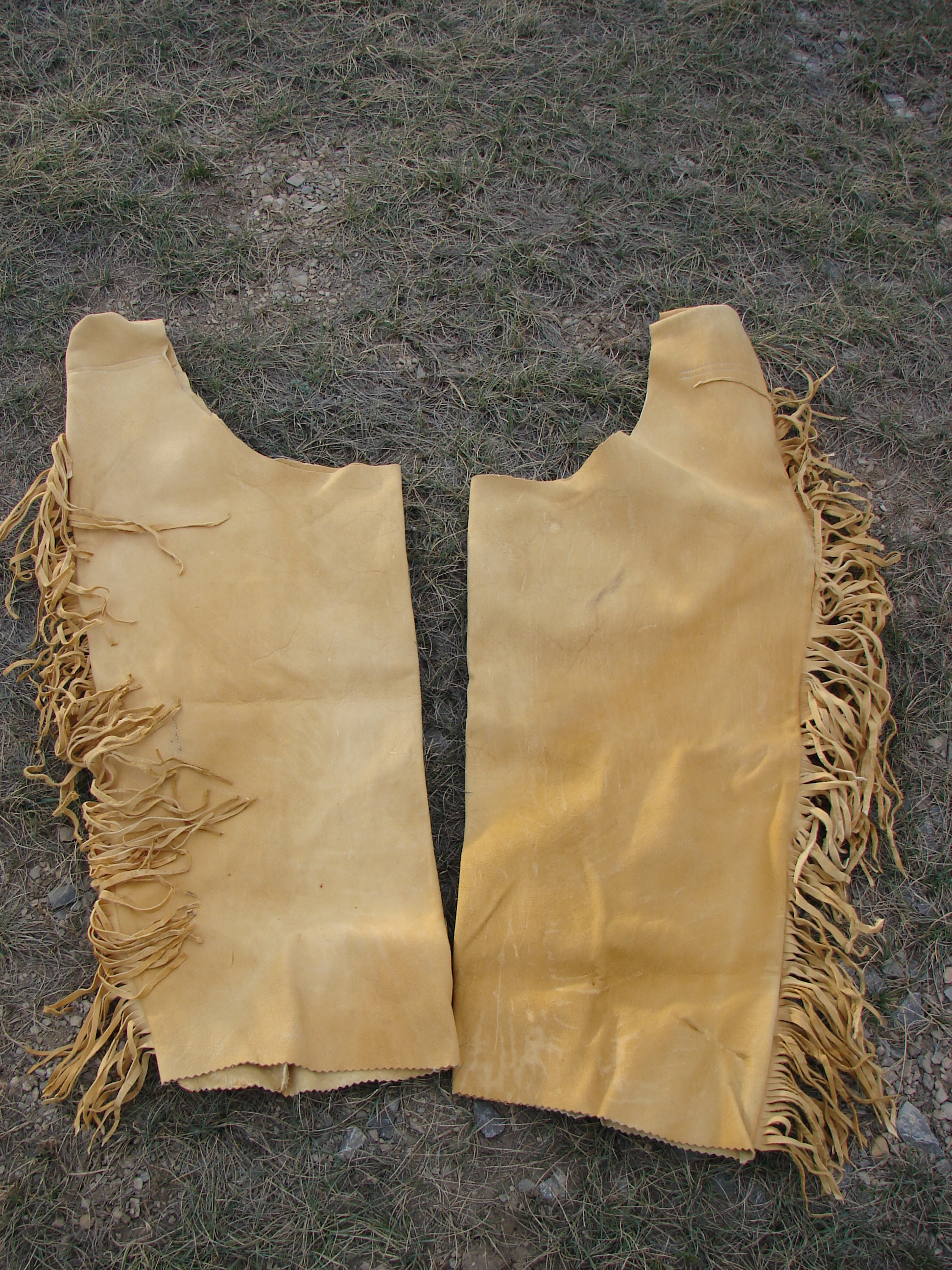 I made a second set of brain tan leggins. These are full length and have a broad loop at the top for my belt. I can wear these over cloth trousers or with a breech clout.
