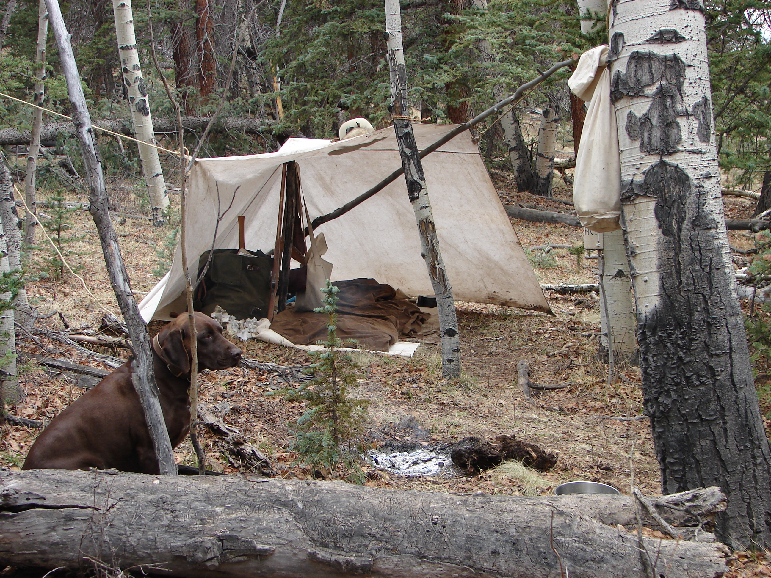 Requirement #3 states “Must have spent an accumulative time of two or more weeks in the wilderness under primitive conditions in the company of no more than one other member. Each stay must be at least three full days and two full nights”. This past weekend I spent Saturday – Monday on a solo camp in my quest to fulfill this requirement. My dogs and I went to a place called Castle Rock Gulch and packed in a little less than 1/2 mile and set up our camp. Saturday was beautiful with a nearly full moon. I cooked some elk steaks over the fire for supper. Sunday clouded up and was windy. I made a change to my canvas and settled in. Monday morning I awoke to an inch of snow on the ground.