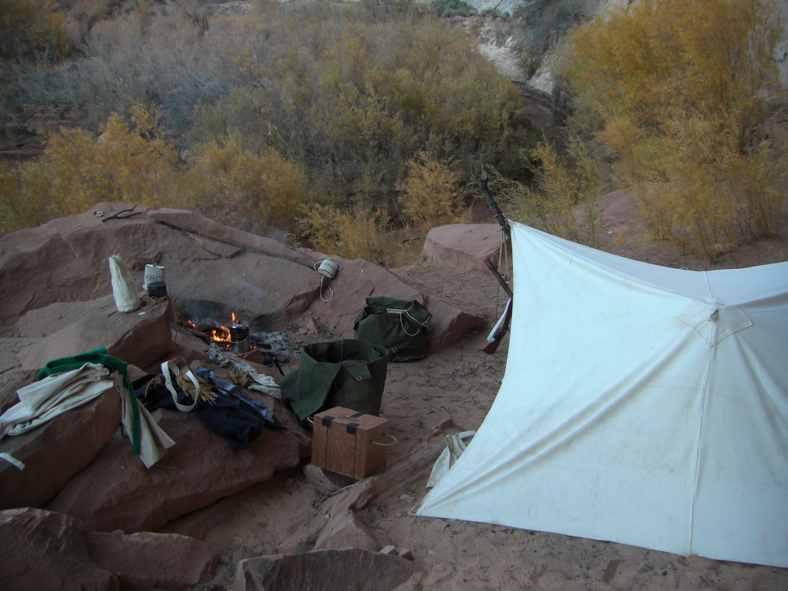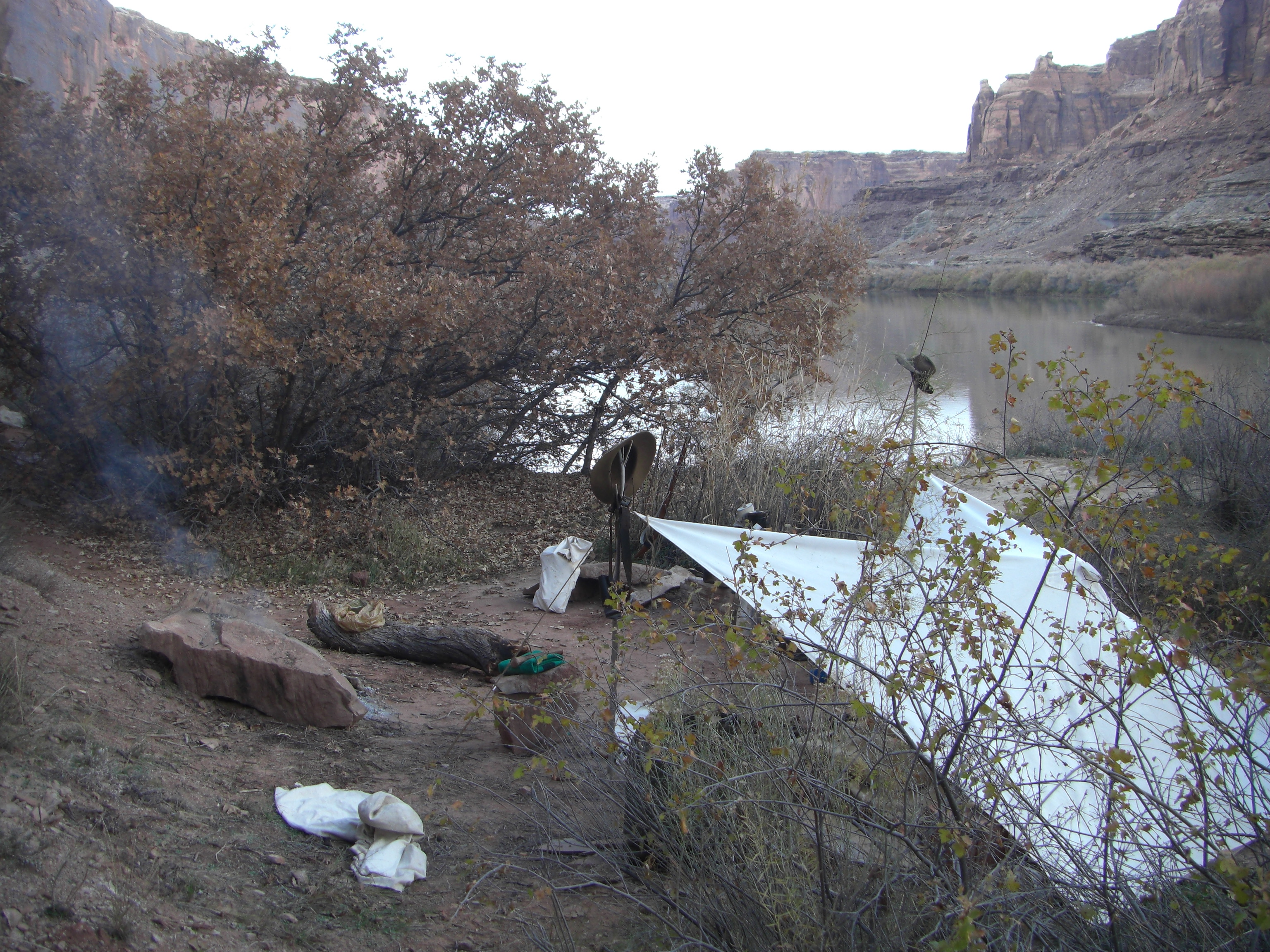 We made 3 trips to haul our stuff to camp and back to the river. Each trip being 1/2 mile around equals 1 1/2 miles to pack into camp and 1 1/2 miles back to the river this morning. We headed downstream and saw the river registry while watching some coots. We travelled 17 1/2 river miles today. We paddled around Bow Knot bend and saw a Grey fox along the bank. Aaron took a shot at it with his pistol before I could bring my rifle into play. The fox ran away and when we checked the riverbank there was no blood or hair so we figured he missed. We made camp on a bench above the river.