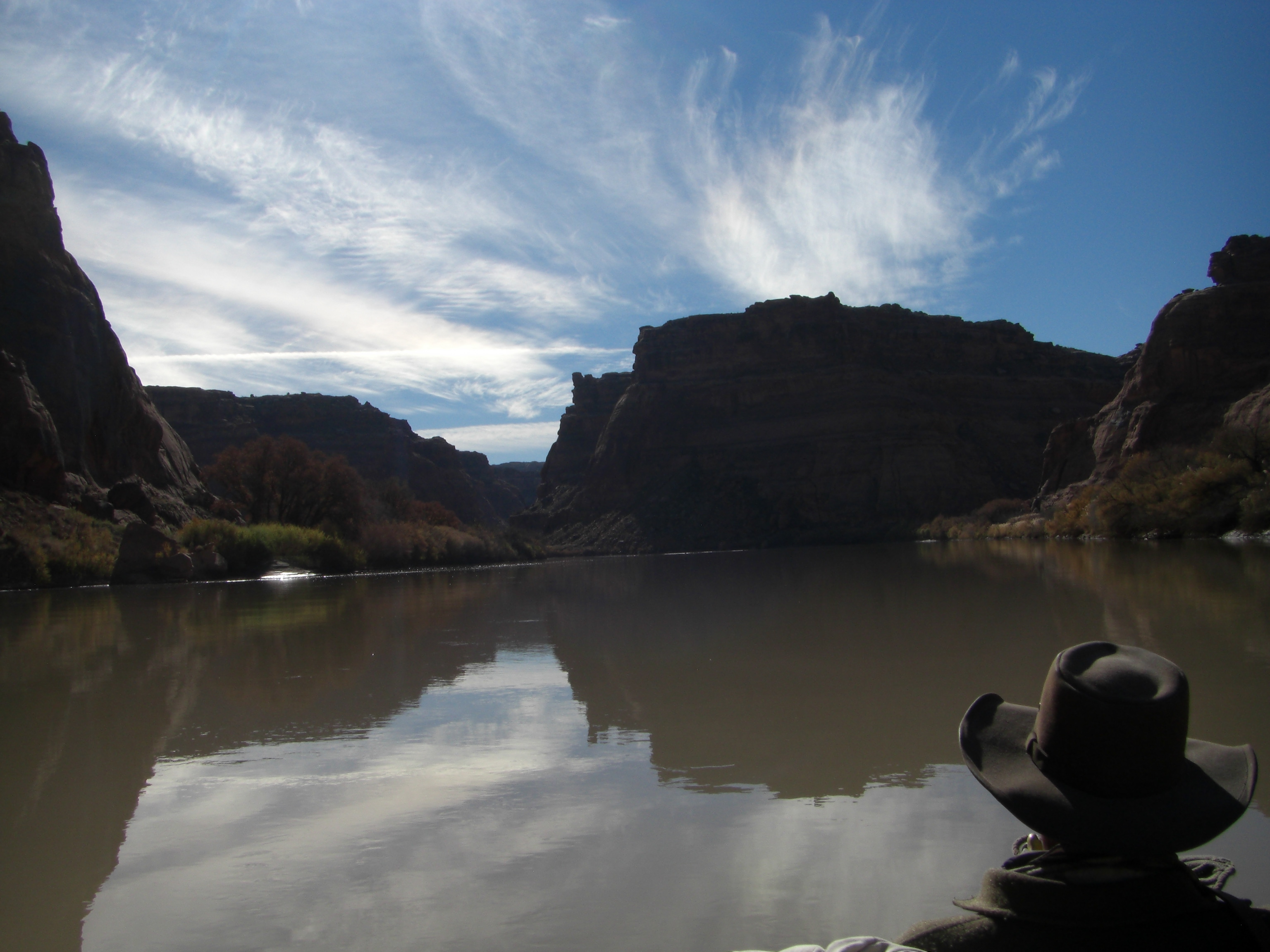 On November 19, 2015, Aaron Griggs and I left Buena Vista, Co and traveled to Moab, UT. It takes 6 hours to drive from my house to Moab via US Hwy 24 and I-70. We stayed at the Motel 6 in Moab. Friday, Nov 20th, we met our driver, Doug at Tag-a-long tours. After paying our fee and filling out a BLM permit, we followed Doug out to Mineral Bottom. We parked Aaron’s truck and loaded our canoe and gear onto Doug’s vehicle and trailer. Doug took us to the town of Green River, UT where we launched our canoe at midday. The State park has a nice boat dock for launching. The launch is at river mile 120.