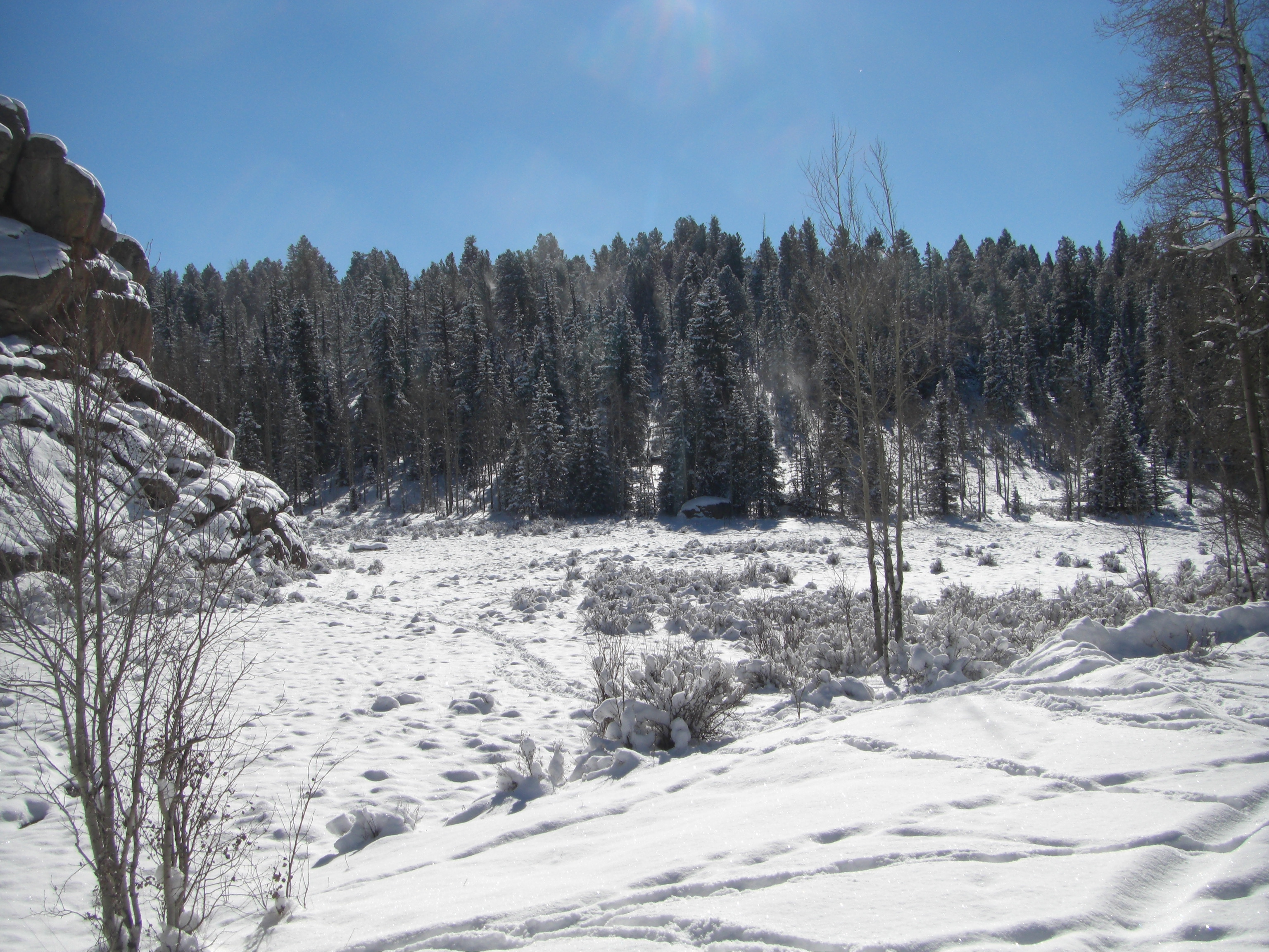 Day 1 – I awoke early on November 27, 2015. It was the Friday after Thanksgiving. Because of other commitments, this would be my last chance this year for a three day weekend in the woods – aux aliment du pays. After loading my gear in the wagon and making sure everything was done for Mrs. Hanratty, I headed down the trail to one of my favorite camps. The maps call it East Castle Rock gulch. I did a solo camp and a hunting camp here in 2012. Bill Gantic and his Labrador retriever, Molly had joined me for the hunting camp. We had had some snow overnight and it was still snowing when I arrived at my campsite. I cleared away 5″ of snow and set up my small wedge tent. After setting camp, I went for an afternoon hunt. As often happens when it is snowing the animals take shelter and there is little movement in the woods. I saw a few rabbit and squirrel tracks under the spruce trees where the snow had not built up yet. I spent an hour or two in the evening reading and writing the story of the six day trip I had just completed down the Green River in Utah. I had a pretty cold night and it continued to snow.