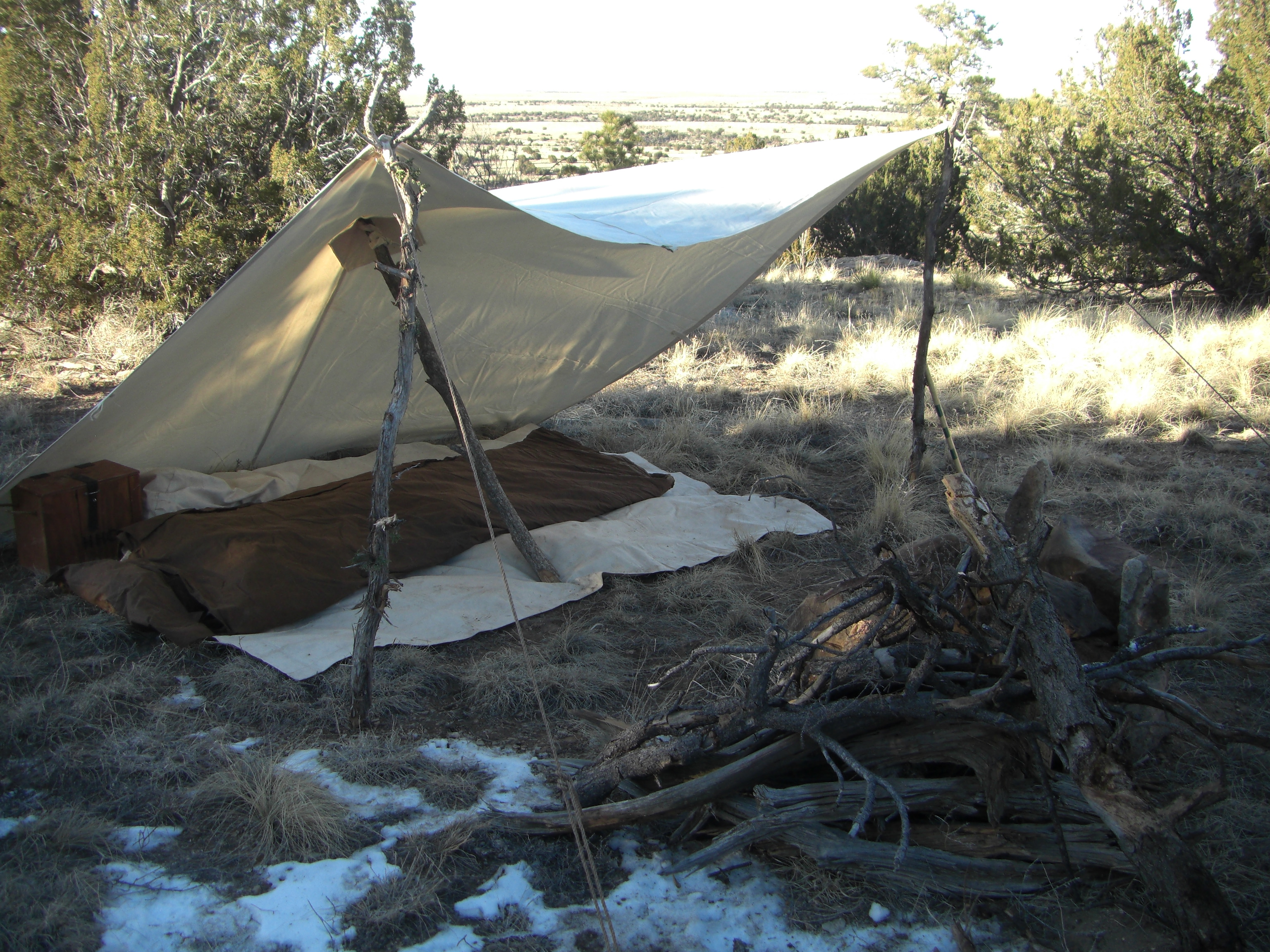 On Saturday January 16, 2016, I left home first thing in the morning headed for an area known as the Apishapa Wildlife Management Area. On the way in, I saw a roadrunner and some prairie dogs. The weather was clear and the temperature had climbed to 42 degrees under the winter sun. When I arrived, I scouted several trails and found myself a place to camp on the south side of a large gully among the western red cedars and Ponderosa pines. There is water in the Apishapa River down in the gully. There is a lot of ice but the water is still accessible. I am east of the Spanish Peaks and Walsenburg, south-east of Greenhorn Mountain and to the north I can see a snow covered peak which is Pike’s Peak. I set up my lean-to and gathered some rocks to make a Blanchard fire pit. I gathered up enough firewood to last the night and laid out my bedroll.
