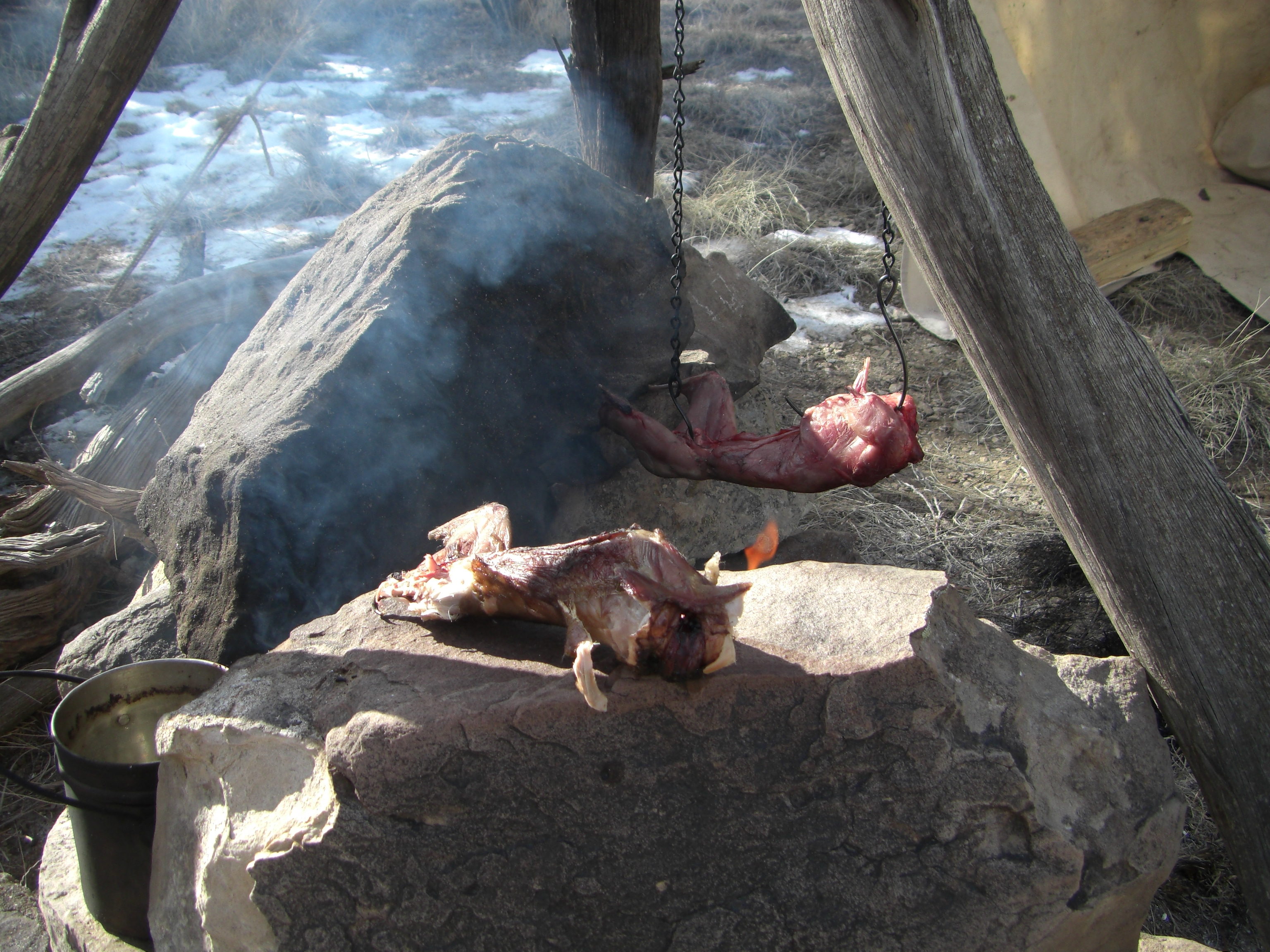 As the afternoon wore on, I took my shotgun and dogs for a hunt. We got into an area of brush & cedars where we started to see cottontail rabbits. At one point the rabbits seemed to be everywhere at once. Between me & the three dogs we had those bunnies steppin’ & fetchin’ like their heads were on fire and their asses were catchin’. I shot at one running but didn’t get my cheek down on the stock and so I shot too high and missed. A little later, I jumped another one and he ran under a cedar which was choked with brush around the trunk. As I circled the tree, I saw it sitting near the trunk in the brush. I put the bead of my shotgun just off of the end of his nose and pulled the trigger. He went down in a heap. I pulled him out of the brush and let the dogs admire it while I reloaded. We didn’t see any more game on our way back to camp. When we arrived at camp, I cleaned my prize and set it out to cool until tomorrow when I will cook it. There is more to eat here than just animals. The Cane cholla fruit and the prickly pear cactus. Wikipedia says of the Cholla fruit: “The fruits are yellowish, tubercular like the stems, and shaped something like the frustum of a cone, with a hollow at the wide end where the flower fell off; they are often mistaken for flowers. The plant retains them all winter. They are dry and not tasty, though the of Arizona and New Mexico are said to have eaten them.” The prickly pear can be singed of its needles and cooked or eaten raw (I have eaten prickly pear at Bent’s Old Fort). I had plenty of bunnies and so did not need to resort to eating these plants. I spent a quiet evening in camp before I turned in just before 9:00 PM. The temperature at bedtime was 30 degrees with a stiff wind from the SSW which made it feel much colder. I rigged an extra bit of canvas over the end of my lean-to in hopes it would block the wind enough so I could sleep.