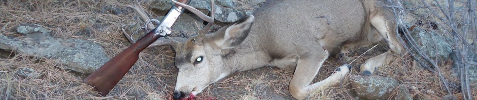 I left the truck about 6:45 and walked north about ¾ of a mile and took a stand near a fallen log that I could use as a backrest. I hadn’t sat there for more than 10 minutes, when I saw a buck working his way along the old Midland railroad grade about 175 yards away. When he disappeared into the trees, I got up and made my way across the small meadow to a large pine and took a seat beneath it. When he came back into view he was less than 70 yards from me. I lined up the sights of my old Winchester 1894 .32 Winchester Special behind his front shoulder and let fly with a 165 grain Hornady Flex-tip bullet. He humped up when I hit him and turned toward me at a walk. He came up the hill a few feet and turned away from me. I was ready to put another shot into him but it wasn’t necessary. He laid down and died under a small tree.