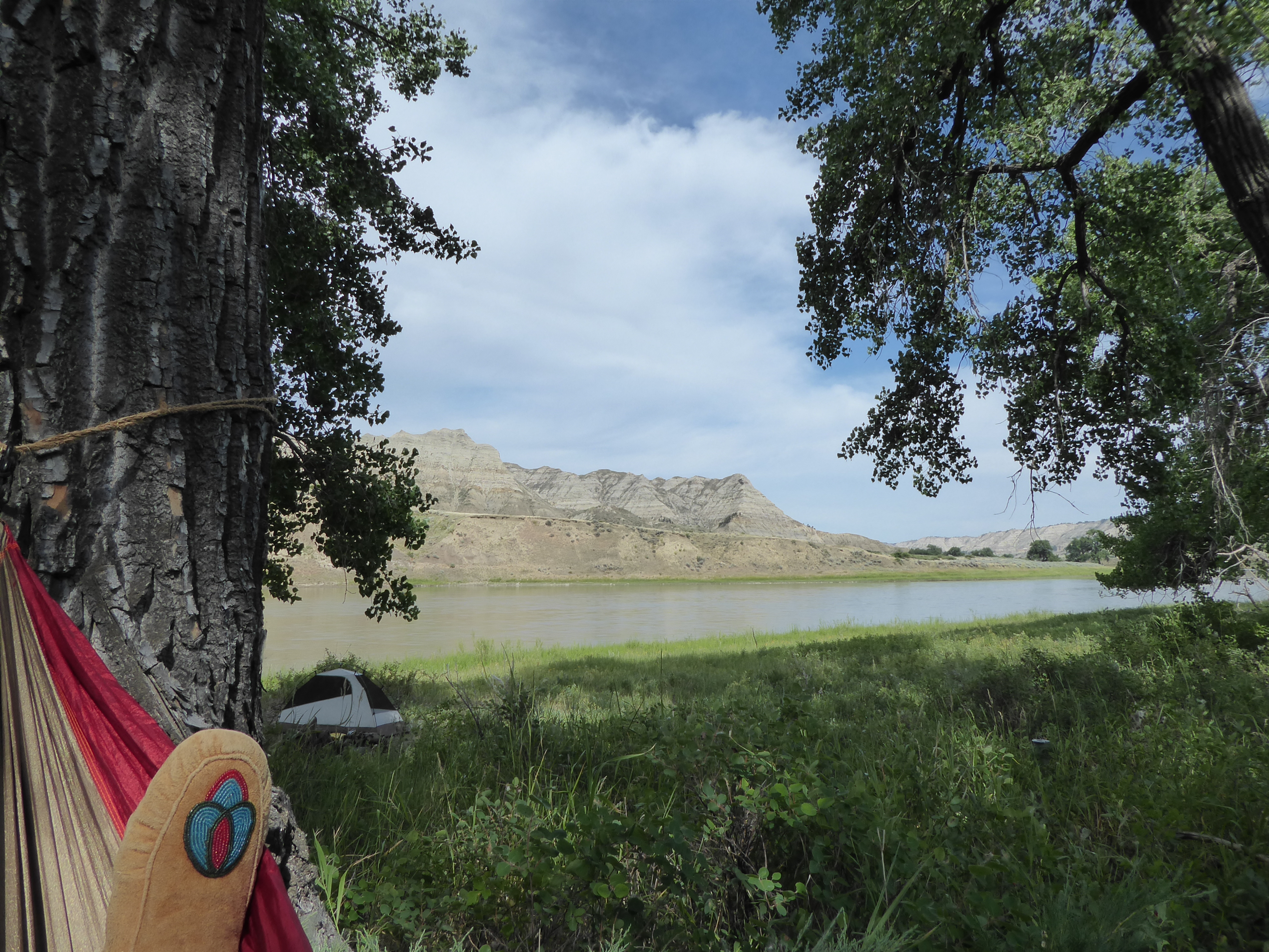Upon arriving at camp, we unloaded the canoe, hung up our hammocks and went swimming in the river. Today we saw an oriel, soft shelled turtles, a teal hen with chicks and coyotes hunting the far river bank and calling in the hills above camp. After swimming we took naps in our hammocks. Steamboat rock was above this camp. 2215 miles above St. Louis.