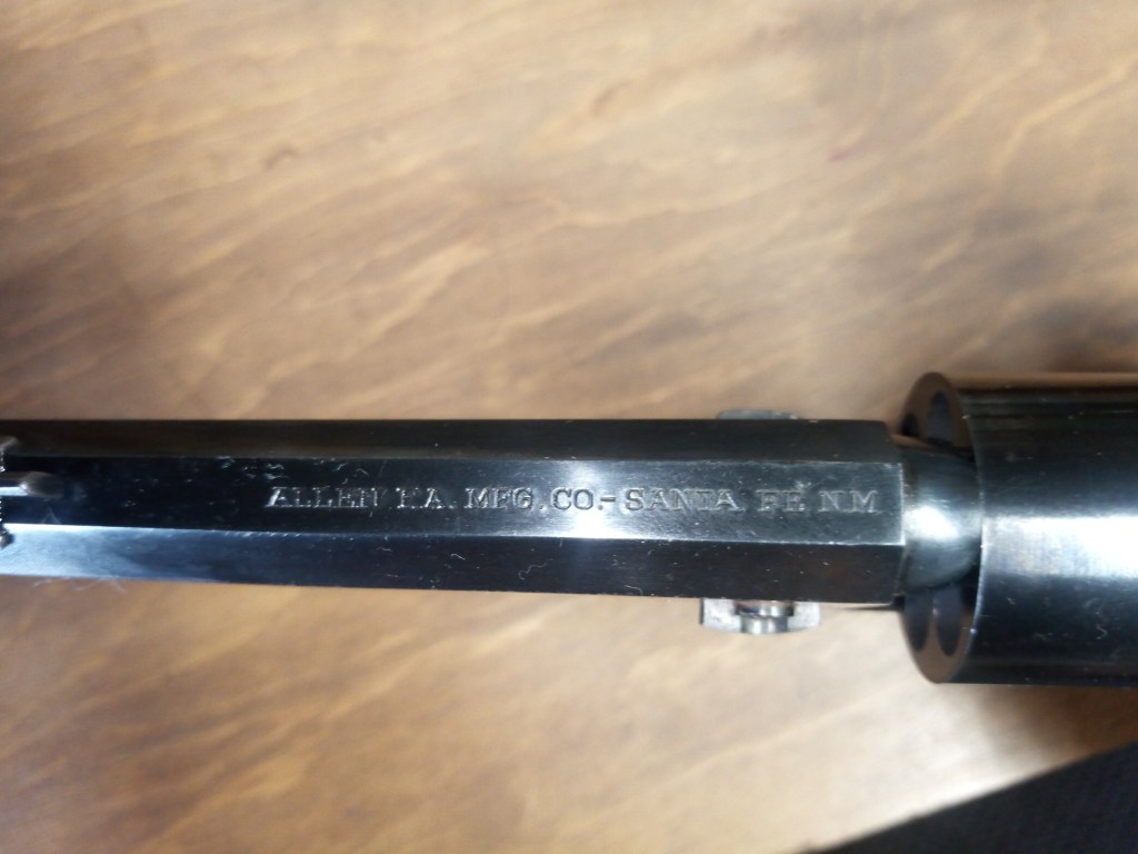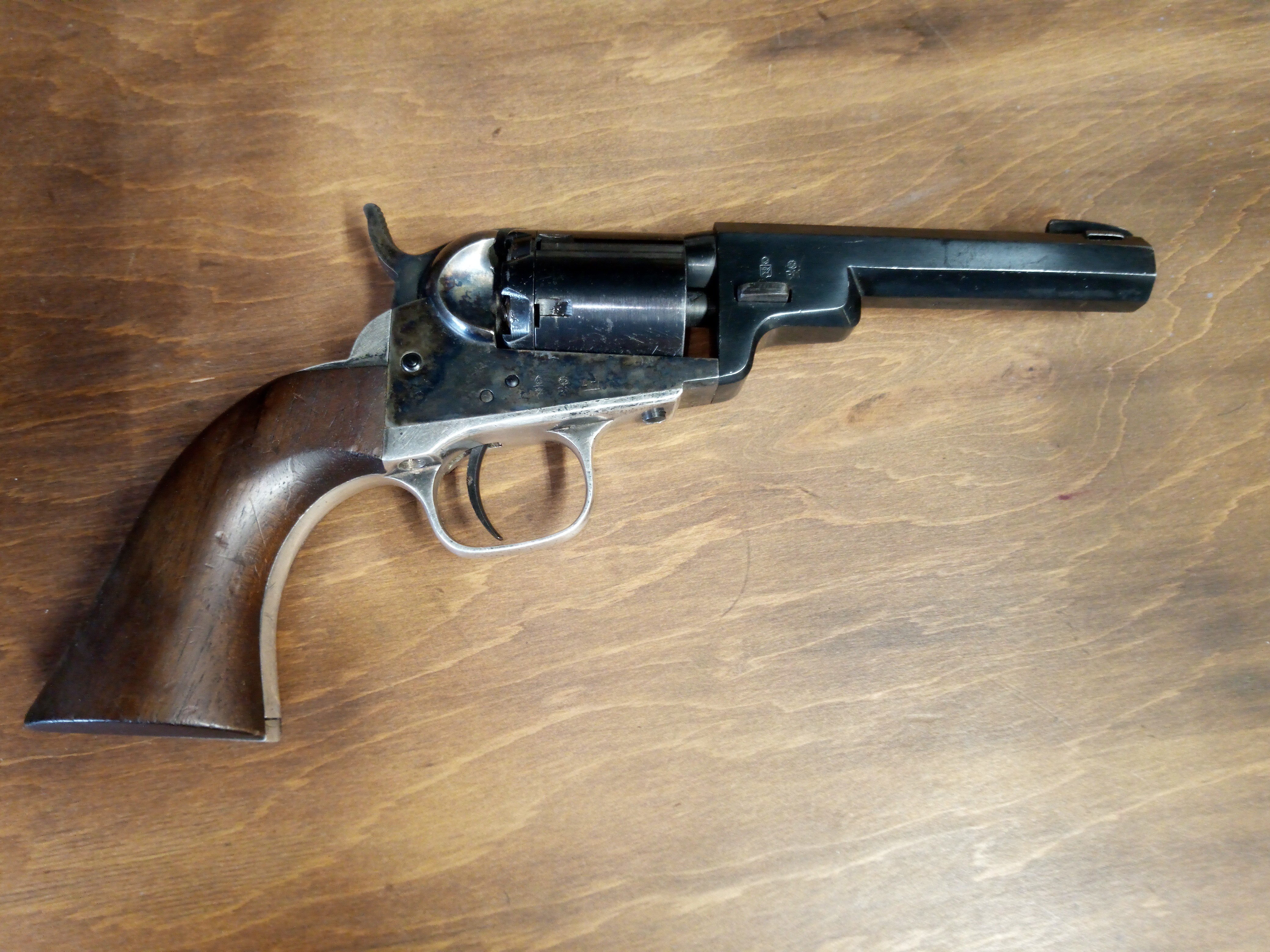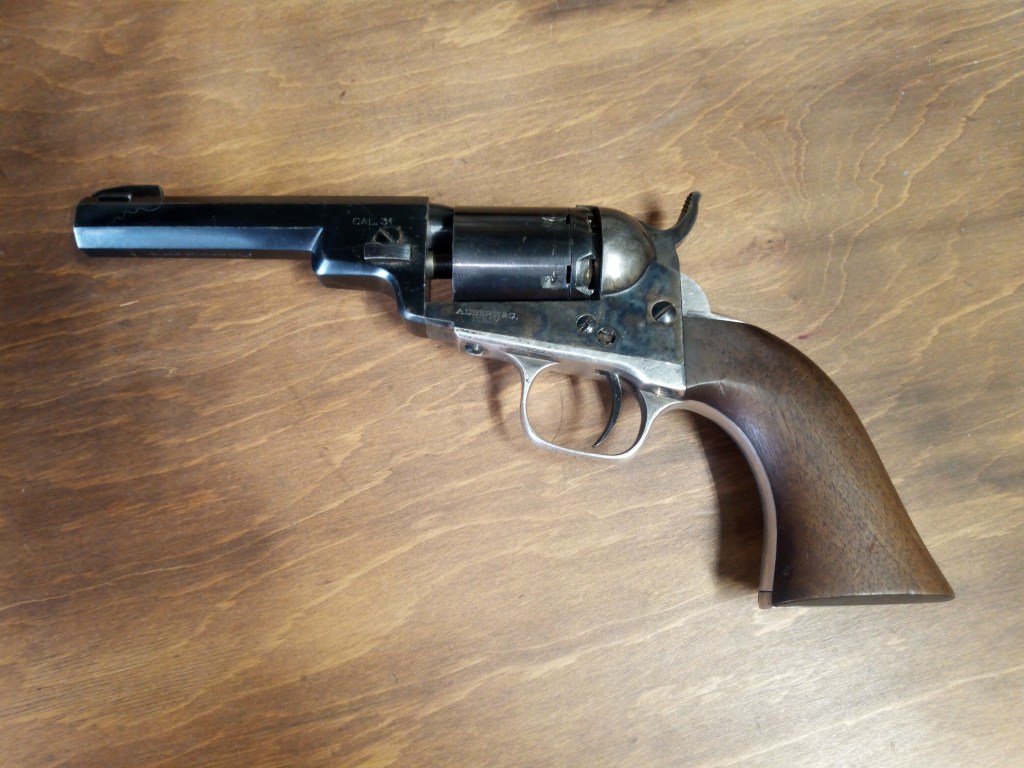 This .31 caliber handgun was one of the biggest sellers of all time for Colt. This one has been converted from percussion to .32 Smith & Wesson. It is a good shooter and works well. I have added a dovetailed front sight to bring point of aim to match point of impact. It is a mild shooting little gun and has become one of my favorites. Its power compares to a .22 rimfire but with a 98-grain bullet. It is a great little trapper’s companion and western re-enactors gun.