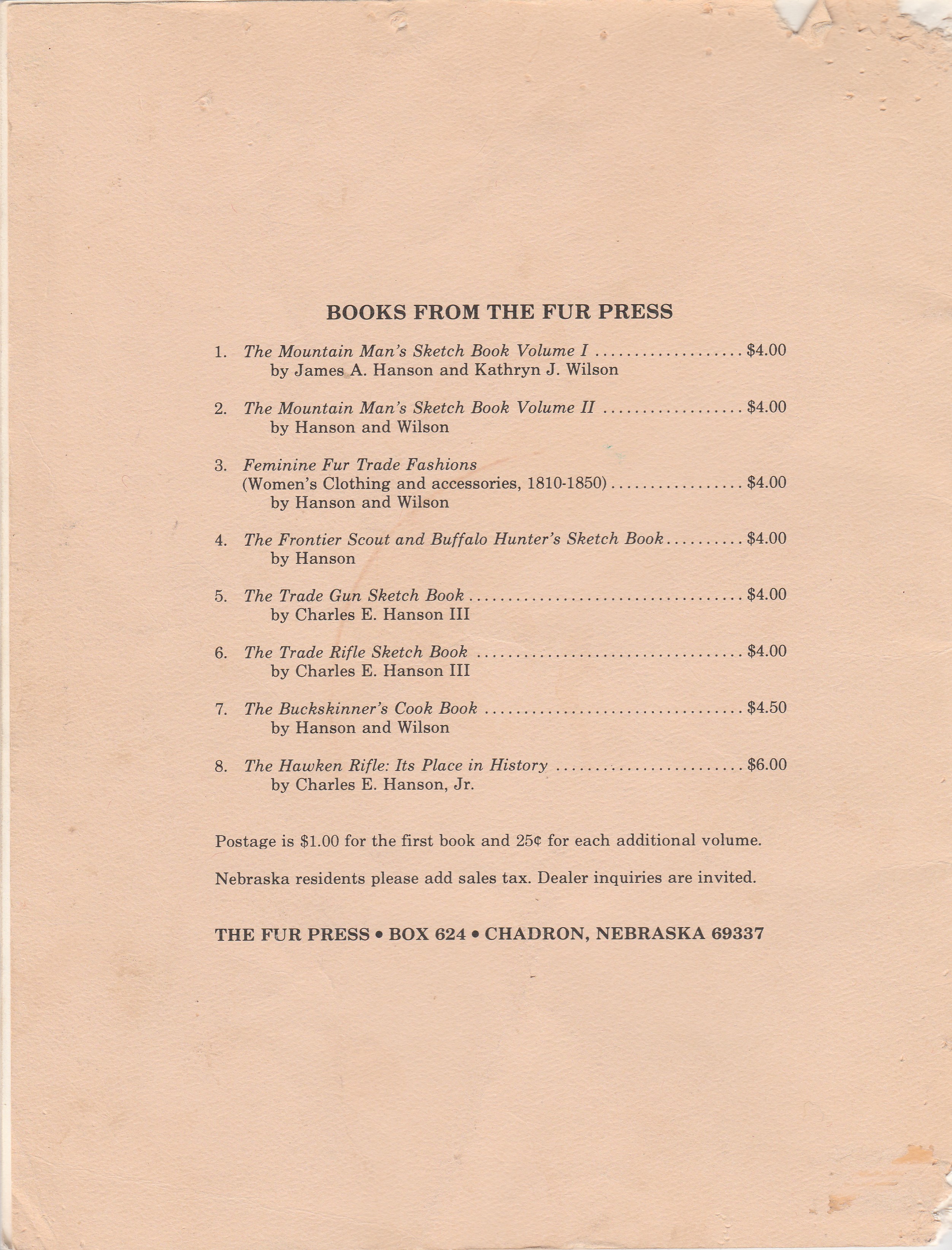 The following list includes some of the books from the Fur Press. Prices are no longer correct.