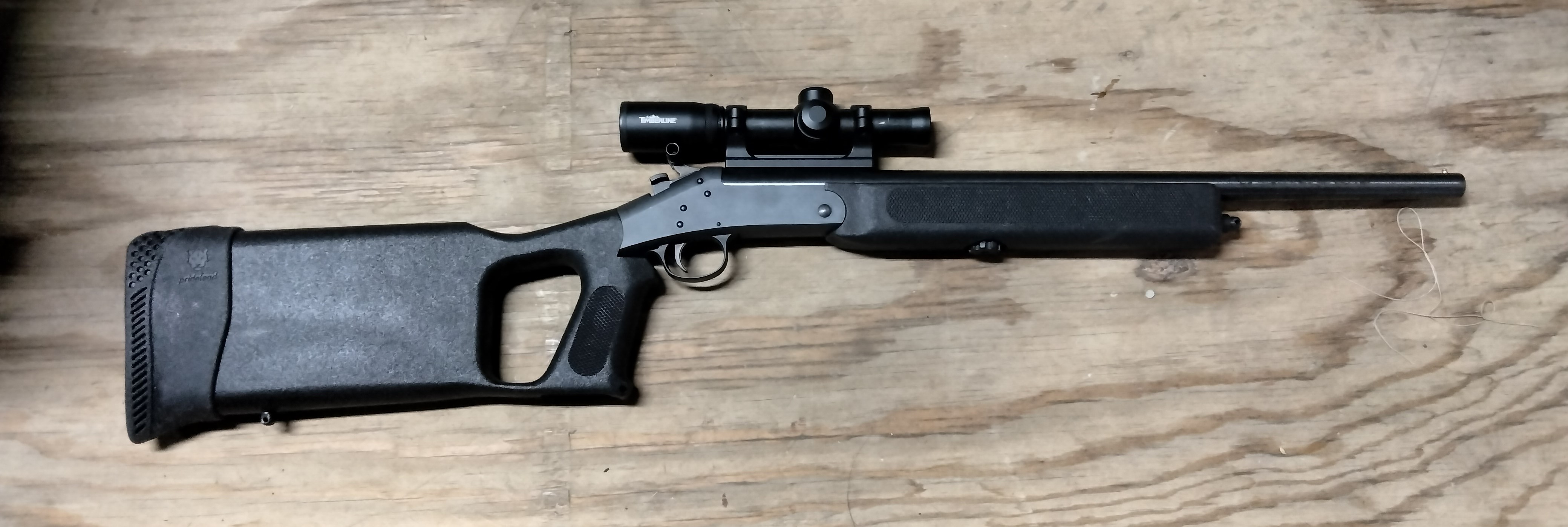 I decided to take the risk and placed my order. A few days later my order arrived, and I am thrilled to say the choke tube fits perfectly! The proof is in the putting, so I took it out to the patterning board for a test drive. Once again, I was very pleased with this purchase. The patterns I got with the use of this choke tube are comparable to any standard .410 shotgun. Not only does this tube constrict the bore as a normal choke does, but it also stops the spin imparted to the shot charge by the .45 caliber rifling. I now have a useful survival weapon and a nice woods walker’s companion. The .45 Colt cartridge is useful for coyotes, hogs, and other critters up to and including White-tail Deer. The .410 shotshells in 3″ are adequate for small game up to turkeys at close range. I found a 20-gauge barrel on Ebay and have installed it to the SB-1 frame, this will allow another option for this gun making it even more versatile.